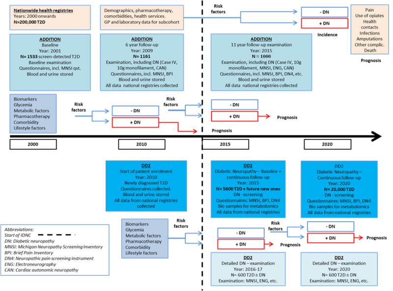 In the prospective ADDITION cohort study and biobank starting in 2001, a screening program in Danish general practices identified 1,533 patients with type 2 diabetes and they continue to be followed. Patients were examined at baseline and at 6-year follow-up, and blood and urine samples were collected. The presence of diabetic neuropathy was assessed at 6 years with the following measures: vibration detection threshold, light touch sensory testing, Michigan Neuropathy Screening Inventory (MNSI), and the Brief Pain Inventory (BPI). The presence of cardiac autonomic neuropathy was assessed using heart rate variability at supine rest and three standard tests (Valsalva, deep breathing, and standing). In this program, patients will be re-examined using the above-mentioned tests and a series of other tests. This will allow us to perform a longitudinal study, investigating the association between changes in metabolic and other risk factors over time and the development of diabetic neuropathy over a 15-year period.